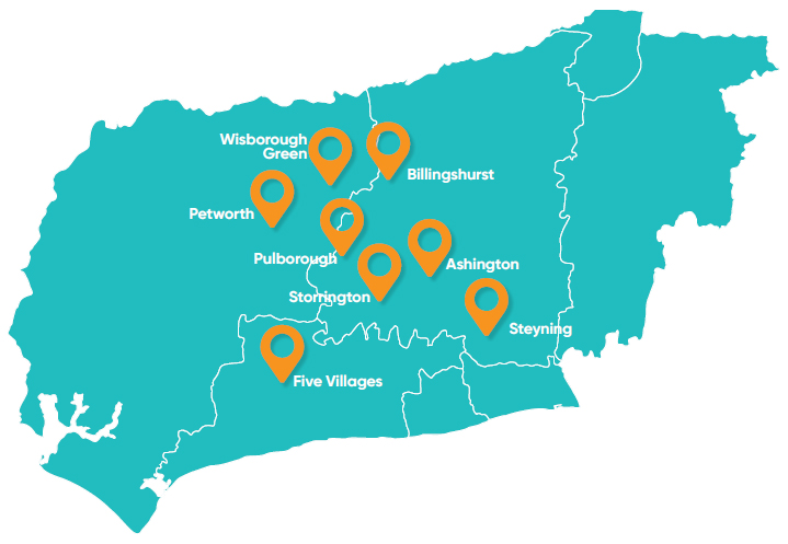 At the heart of what we do is a commitment to the communities of West Sussex. We provide reliable transport solutions for people and groups who need them most. Our fleet of 10 modern minibuses operate from 8 local hubs marked in orange below.